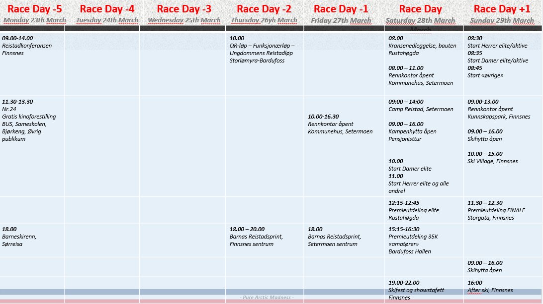 Reistadløpsuka mars 23. Reistadkonferansen mandag 23. mars 2026 09:00 14:00 Google Calendar ICS Finnsnes Vis arrangement → mars 23. Gratis kinoforestilling: Nr. 24 mandag 23. mars 2026 11:30 13:30 Google Calendar ICS Vis arrangement → mars 23. Barneskirenn Sørreisa mandag 23. mars 2026 18:00 22:00 Google Calendar ICS Vis arrangement → mars 26. QR løp torsdag 26. mars 2026 10:00 22:00 Google Calendar ICS Funksjonærløp, Ungdommens ReistadløpStorlømyra - Bardufoss Vis arrangement → mars 26. Barnas Reistadsprint torsdag 26. mars 2026 18:00 20:00 Finnsnes Norge (kart) Google Calendar ICS Vis arrangement → mars 27. Rennkontor åpent fredag 27. mars 2026 10:00 16:30 Bardu Kommunehus (kart) Google Calendar ICS Vis arrangement → mars 27. Barnas Reistadsprint fredag 27. mars 2026 18:00 22:00 Setermoen Norge (kart) Google Calendar ICS Vis arrangement → mars 28. Kransenedleggelse lørdag 28. mars 2026 08:00 09:00 Rustahøgda Bardufoss Norge (kart) Google Calendar ICS Vis arrangement → mars 28. Rennkontor Åpent lørdag 28. mars 2026 08:00 11:00 Bardu Kommune (kart) Google Calendar ICS Vis arrangement → mars 28. Camp Reistad lørdag 28. mars 2026 09:00 14:00 Setermoen Norge (kart) Google Calendar ICS Vis arrangement → mars 28. Kampenhytta åpen lørdag 28. mars 2026 09:00 16:00 Kampenhytta Norge (kart) Google Calendar ICS Pensjonisttur Vis arrangement → mars 28. Premieutdeling Elite lørdag 28. mars 2026 12:15 12:45 Bardufoss, Troms Norway (kart) Google Calendar ICS Vis arrangement → mars 28. Premieutdeling 35KM lørdag 28. mars 2026 15:15 16:30 Bardufosshallen Bardufoss, Troms Norway (kart) Google Calendar ICS Vis arrangement → mars 28. Skifest og Showstafett lørdag 28. mars 2026 19:00 22:00 Finnsnes Norge (kart) Google Calendar ICS Vis arrangement → mars 29. Rennkontor åpent søndag 29. mars 2026 09:00 13:00 Kunnskapspark (kart) Google Calendar ICS Vis arrangement → mars 29. Skihytta åpen søndag 29. mars 2026 09:00 16:00 Finnsnes Norge (kart) Google Calendar ICS Vis arrangement → mars 29. Ski Village søndag 29. mars 2026 10:00 15:00 Finnsnes Norge (kart) Google Calendar ICS Vis arrangement → mars 29. Premieutdeling Finale søndag 29. mars 2026 11:30 12:30 Storgata Finnsnes, Troms Norway (kart) Google Calendar ICS Vis arrangement → mars 29. Afterski søndag 29. mars 2026 16:00 22:00 Finnsnes Norge (kart) Google Calendar ICS Vis arrangement →